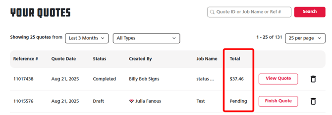 Tip: You can see if either your quotes in View or Finish status have received a pricing by looking under the Total column at the right of the quote in the Quotes tab. You will either see a price or Pending depending on if you have received a price or not.