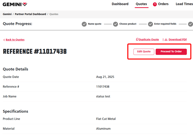 View Quote status is for completed quotes eligible to be turned into orders in the Quotes tab at the top of the screen. They can be ordered with or without receiving pricing from a Gemini team member, unlike Finish Quotes.