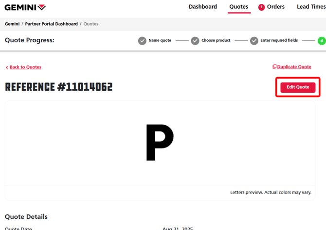 When clicking the white View Quote button, you can Edit Quote or Proceed To Order if your quote isn’t customized and hasn’t been turned into an order. You can choose to edit or order by clicking the respective buttons at the top of the screen to the right of your quote’s Reference Number page.