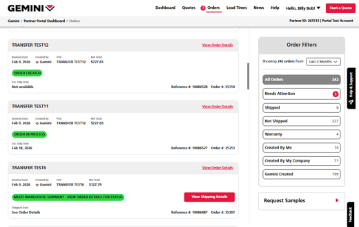 - The PO number on the Order screen in the portal will now reflect any updates that maybe made in the internal Gemini system.