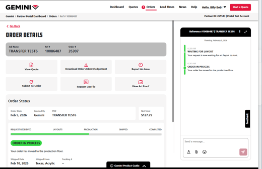 - We've fixed the issue where the Partner Portal discount was not applying when an order is created directly bypassing the need for a quote or when a Gemini rep creates a quote for you and you are ordering it and the issue where art files are not being carried forward from a quote entered by a Gemini rep to an order.