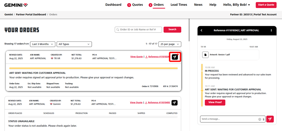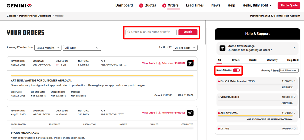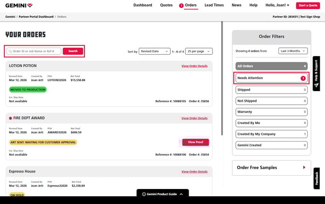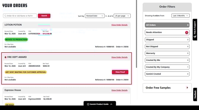 Tip: You can enter your Order ID, Job Name or Reference Number into the search bar at the top right to pull up your order faster. Additionally, you can use the Needs Attention toggle in the Help & Support panel to help filter for art proofs needing approval along with other orders on hold.