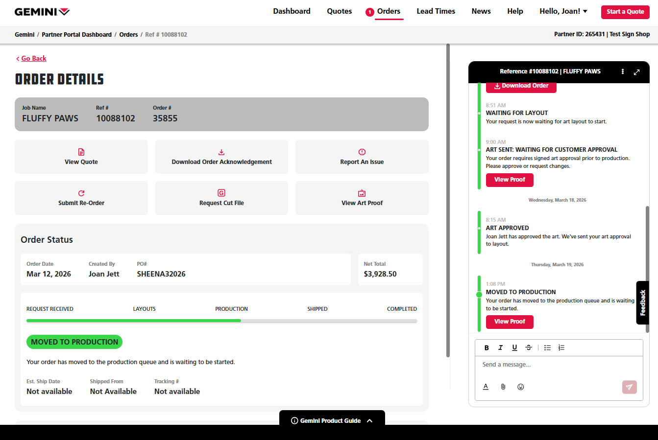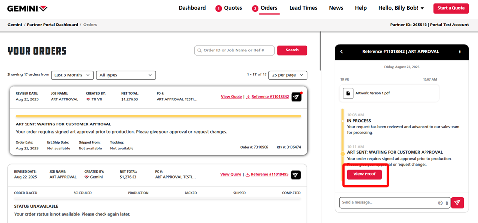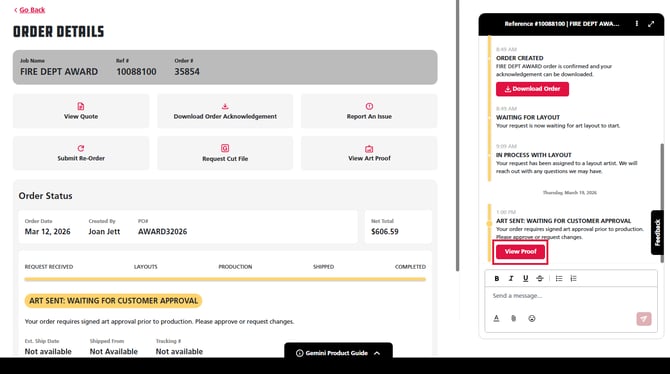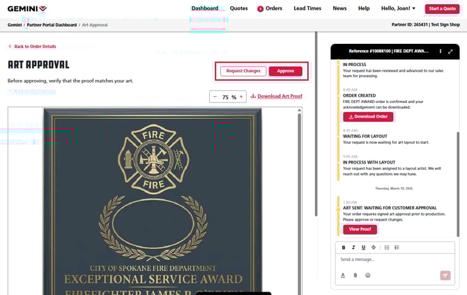 Once your order has moved to layouts, your art proof will be available on your Partner Portal account where you can request changes or give approval before your order moves to production. Follow the steps below to learn how to review your art proof in Partner Portal.
