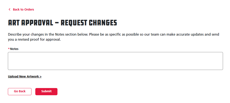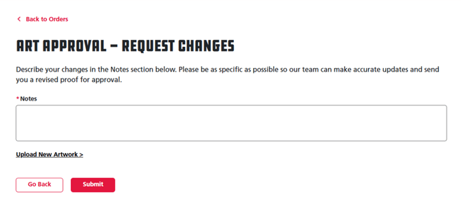 a. If you clicked the Request Changes button, a Notes text box will appear below for you to enter the edits you want to make to your art proof. Below the provided text box is a black Upload New Artwork link for you to submit any new artwork files if desired. Once you have finished making edits, click the red Submit button below to proceed or the white Back button to cancel the requested change.
