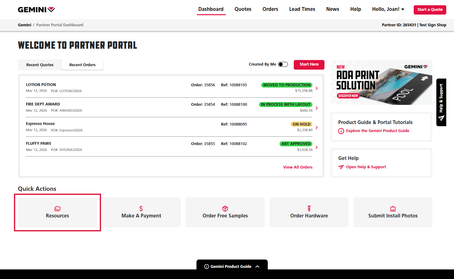 2. Within the main Dashboard homepage, click on the Resources tile on the middle left of the screen to access the Gemini Resources page.