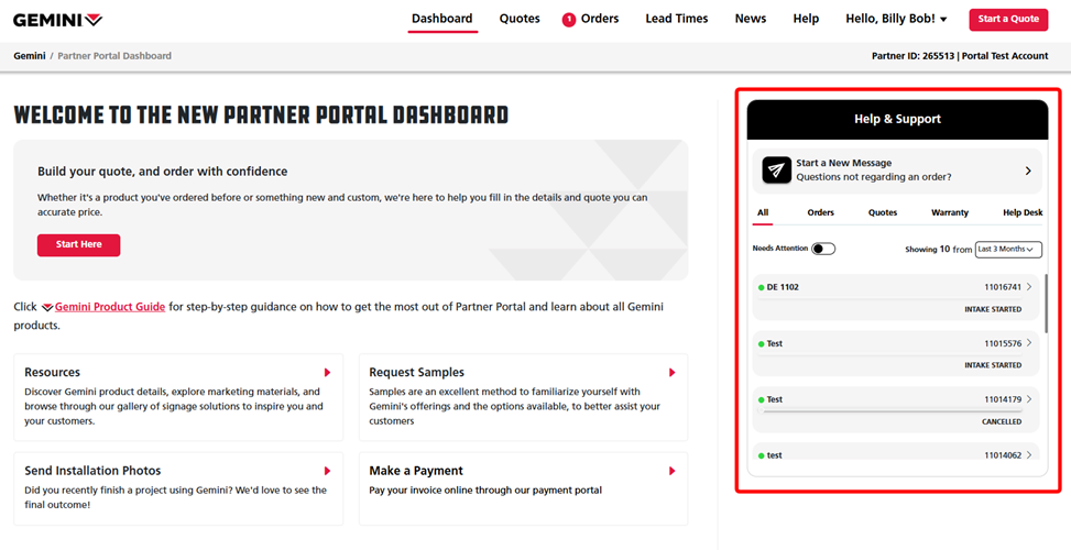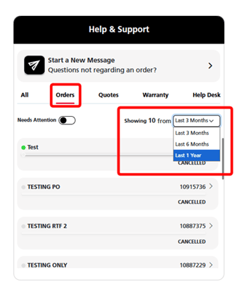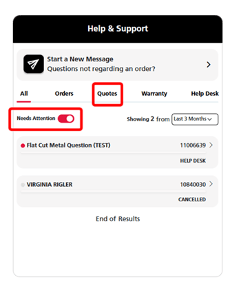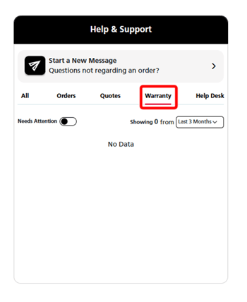 The Help & Support panel allows you to easily navigate to your company's most recent quotes, orders, warranty claims, and general questions without leaving the dashboard. Learn about the filters you can use in the Help & Support panel.