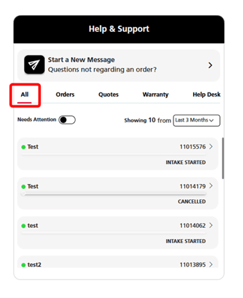 The All tab shows every quote, order, and warranty that you or your company have entered in the last 12 months. At a glance, you can see the name, Reference Number, and status of your quote or order. When you click on your quote or order, you can see more details about the status of your request. You are also able to message a team member on that specific request.