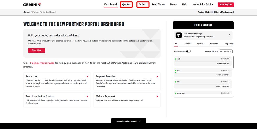 The Quotes tab shows every quote that you or your company have requested from Gemini up to the last 12 months. Clicking on a quote will provide an order number if the quote has been converted into an order.