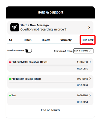The Help Desk tab displays general messages not associated with an existing quote, order, or warranty.