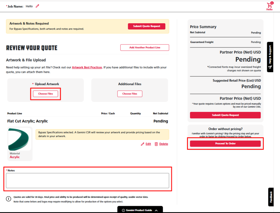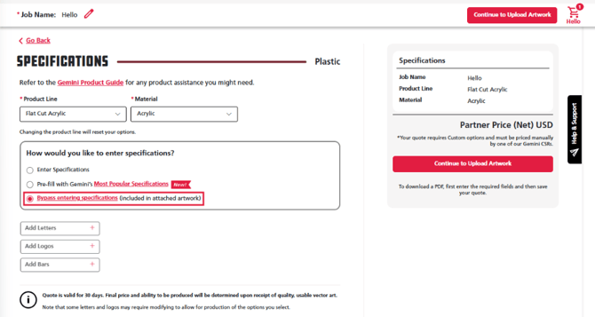 Note: When selecting Bypass Entering Specifications, Artwork and Notes are required to place an order.