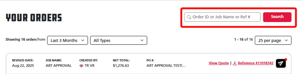 Tip: You can enter your order’s ID, Job Name, or Reference Number into the search bar at the top right to pull up your order faster.