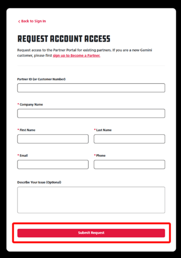 Caution: You must be a Gemini Partner before being eligible to request a Partner Portal account. To become a Gemini Authorized Partner, visit our page.