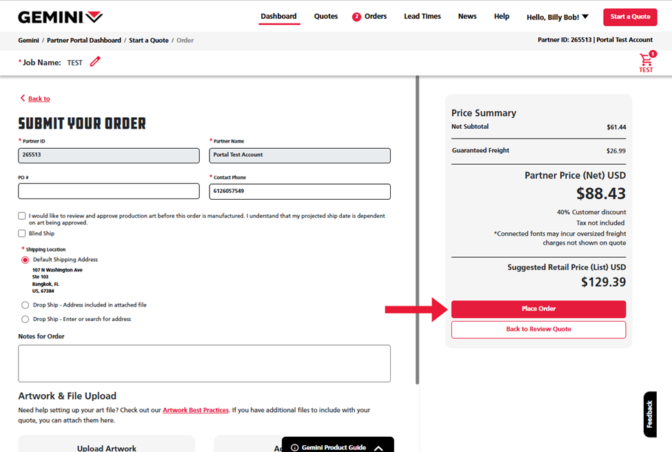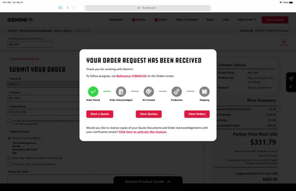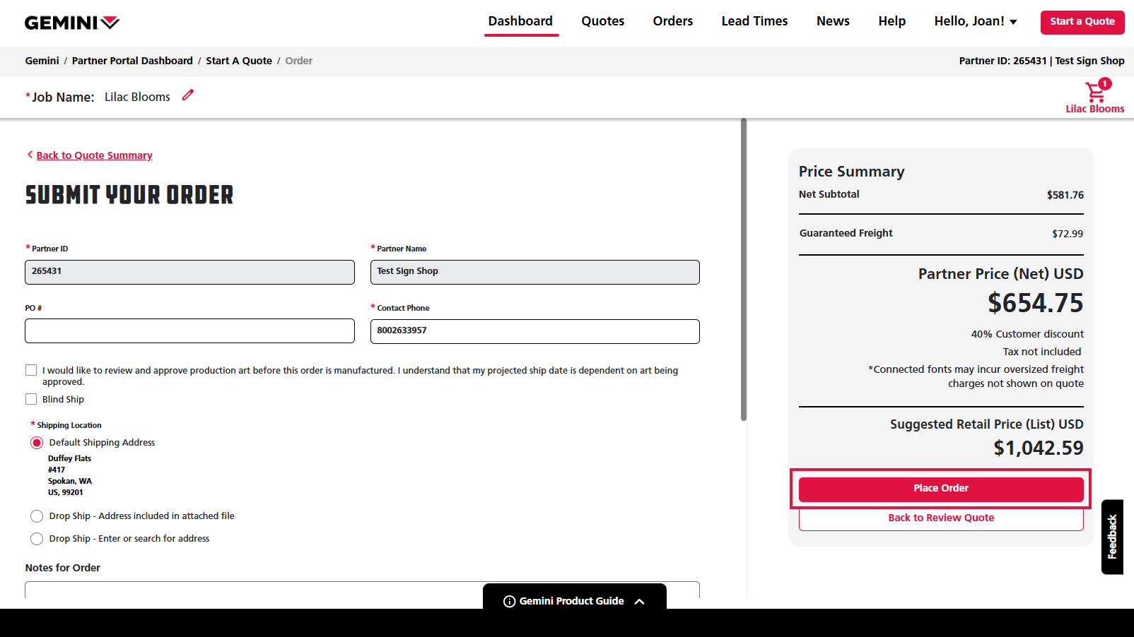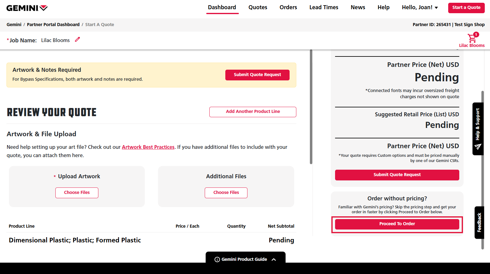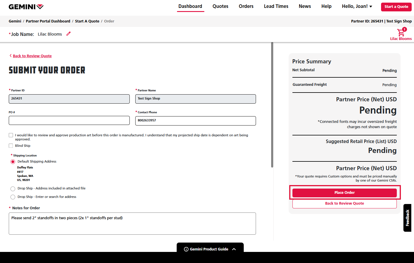 Submitting an order is easy in Gemini's Partner Portal. You can place an order with or without pricing depending on your project. To learn which way is best for you, just follow one of these two main methods to start submitting your orders in Partner Portal.