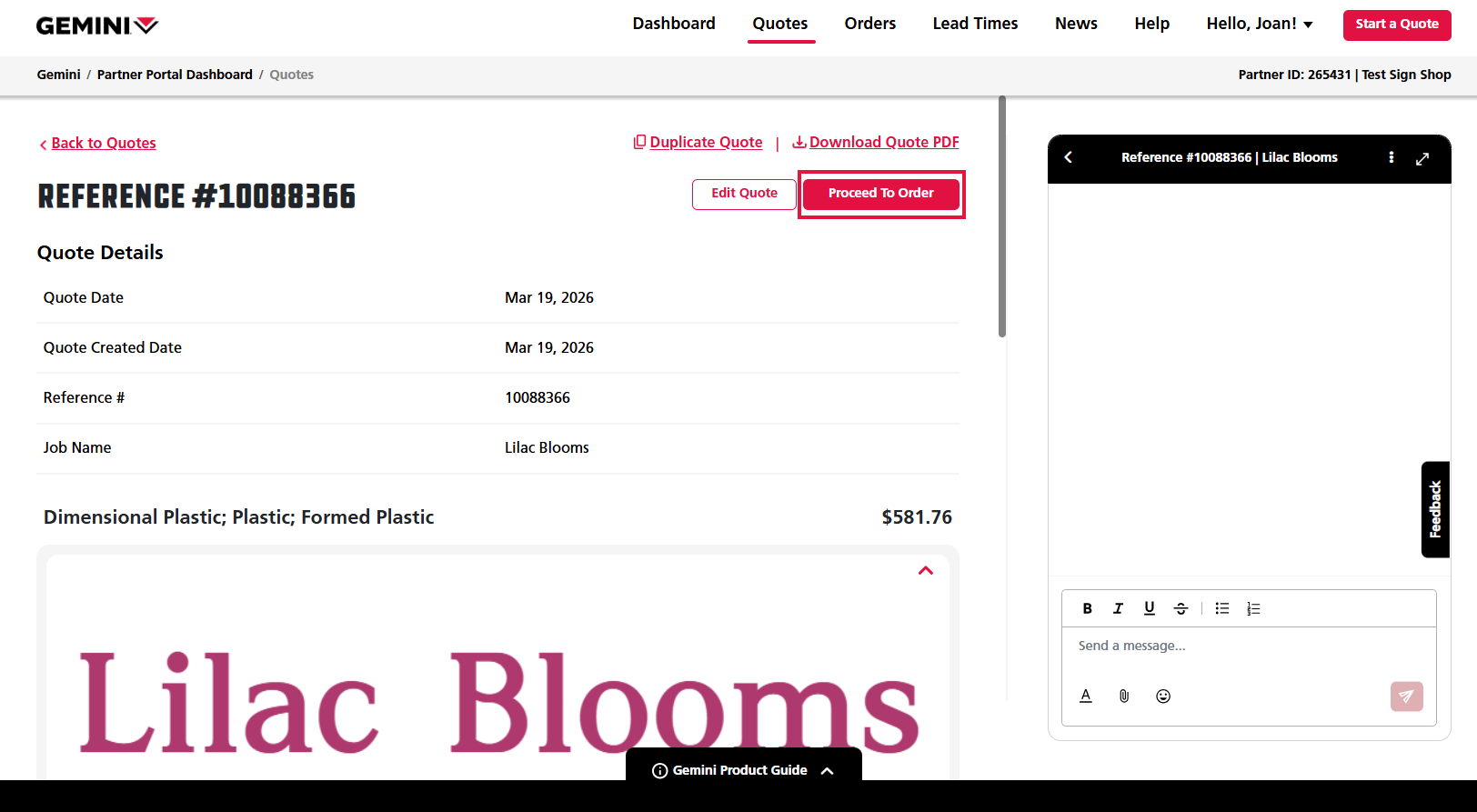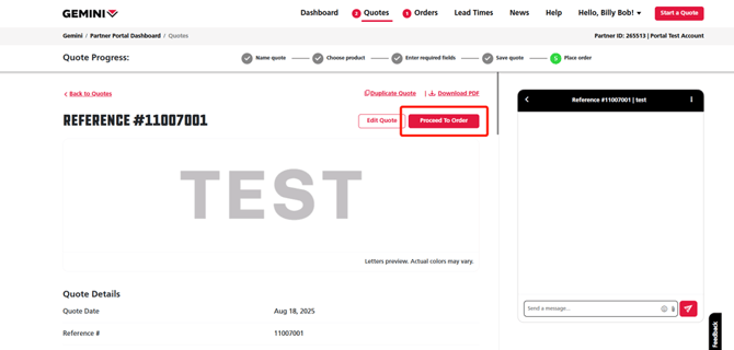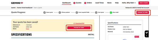4. To the right of the Reference Number, click the red Proceed to Order button to turn your quote into an order.