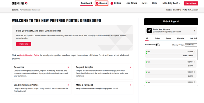1. Log into Partner Portal and create a quote by clicking either the red Start Here or Start a Quote buttons on the Dashboard.