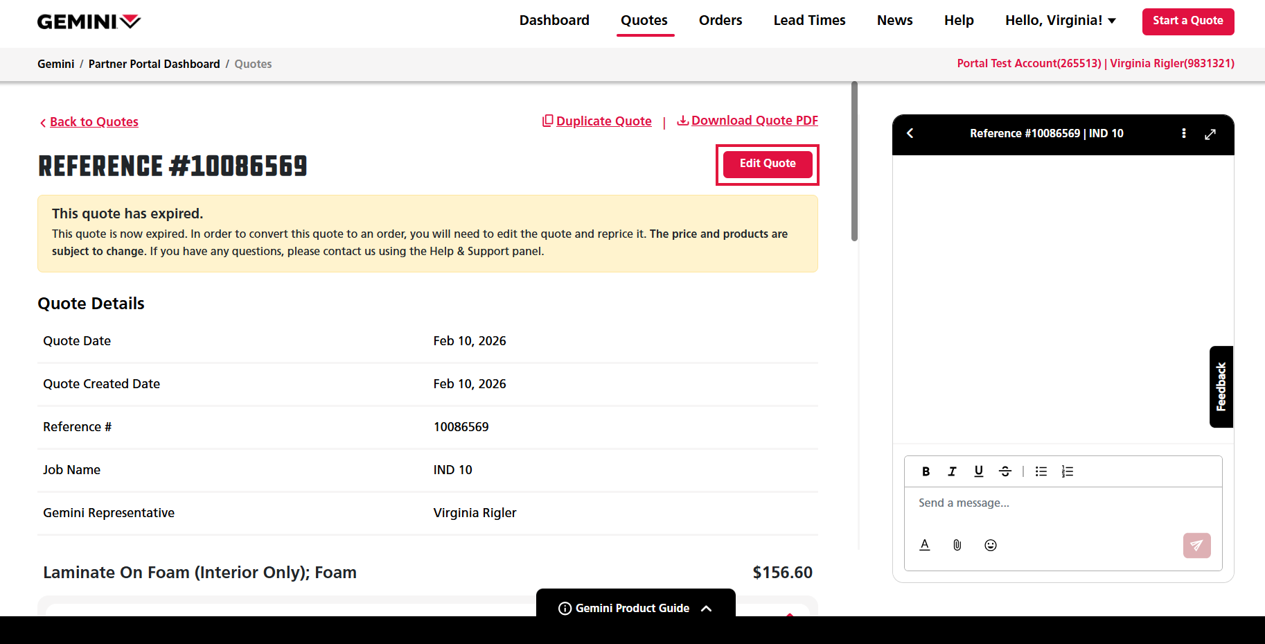 4. Once at your quote’s Reference Number page, a yellow banner will indicate your quote is expired. To update it, click the red Edit Quote button located to the right of the Reference Number.