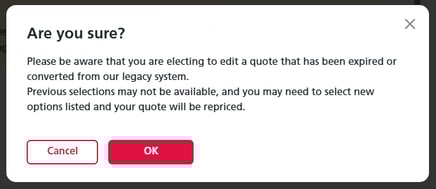 5. A prompt will appear asking you to confirm to proceed editing your quote. Click the red OK button to do so, or the white Cancel button if you would like to keep the quote expired.