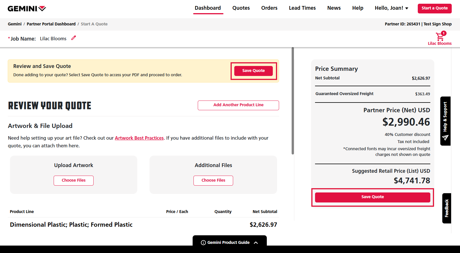 7. Once you have finished making edits to your quote, click the red Save Quote either at the top or bottom right corner if your quote has standard specifications.