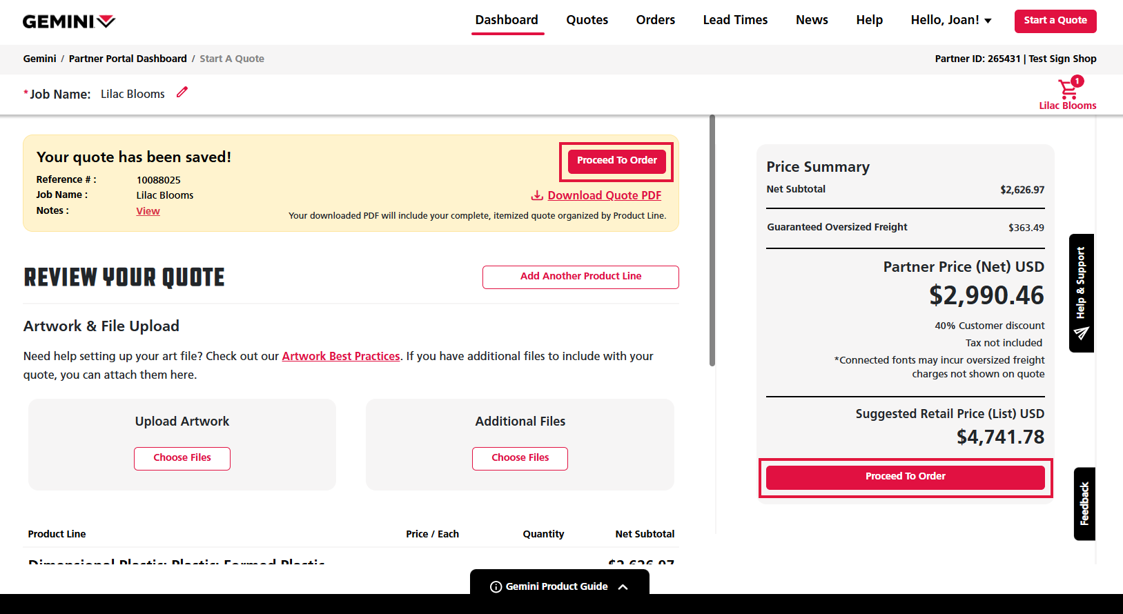 8. After saving your standard quote, click the red Proceed to Order buttons at the top or bottom of the screen turn your quote into an order.