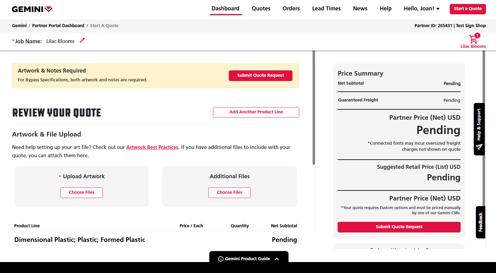 Note: If your quote has a custom request, click the red Submit Quote Request button to get an estimate on your quote at the top or bottom right. Click the red Proceed to Order button to proceed to order without pricing at the bottom right.