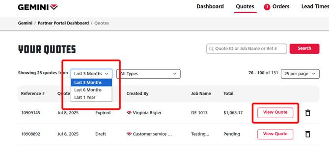 Tip: Not seeing your quote? Try filtering the date between the Last 3 Months to Last 1 Year by clicking the drop-down above the provided quote list.