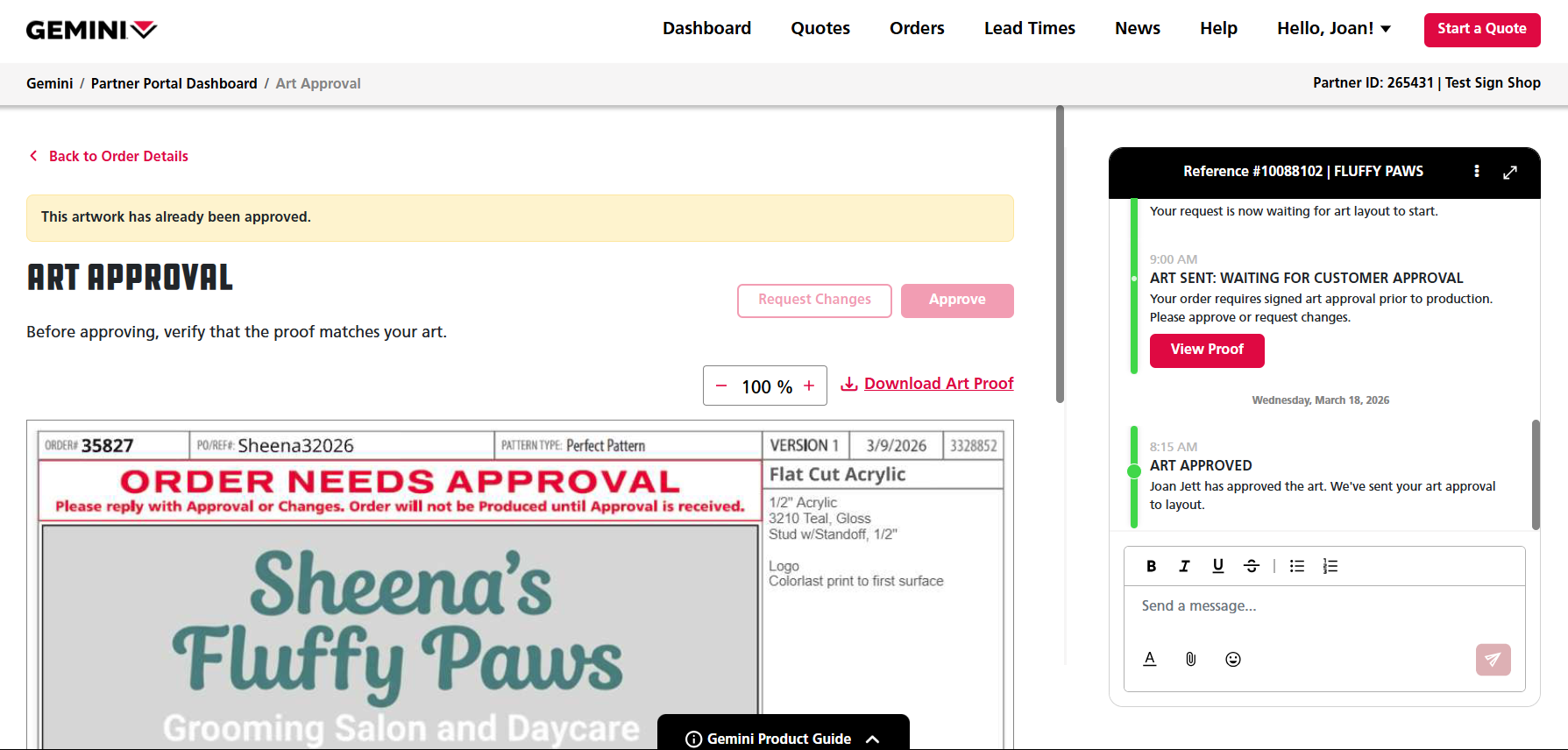 | Partner Portal keeps art modifications all in one place. You can submit artwork with an order and approve or request changes to the art right within your Partner Portal account. | ![]() |