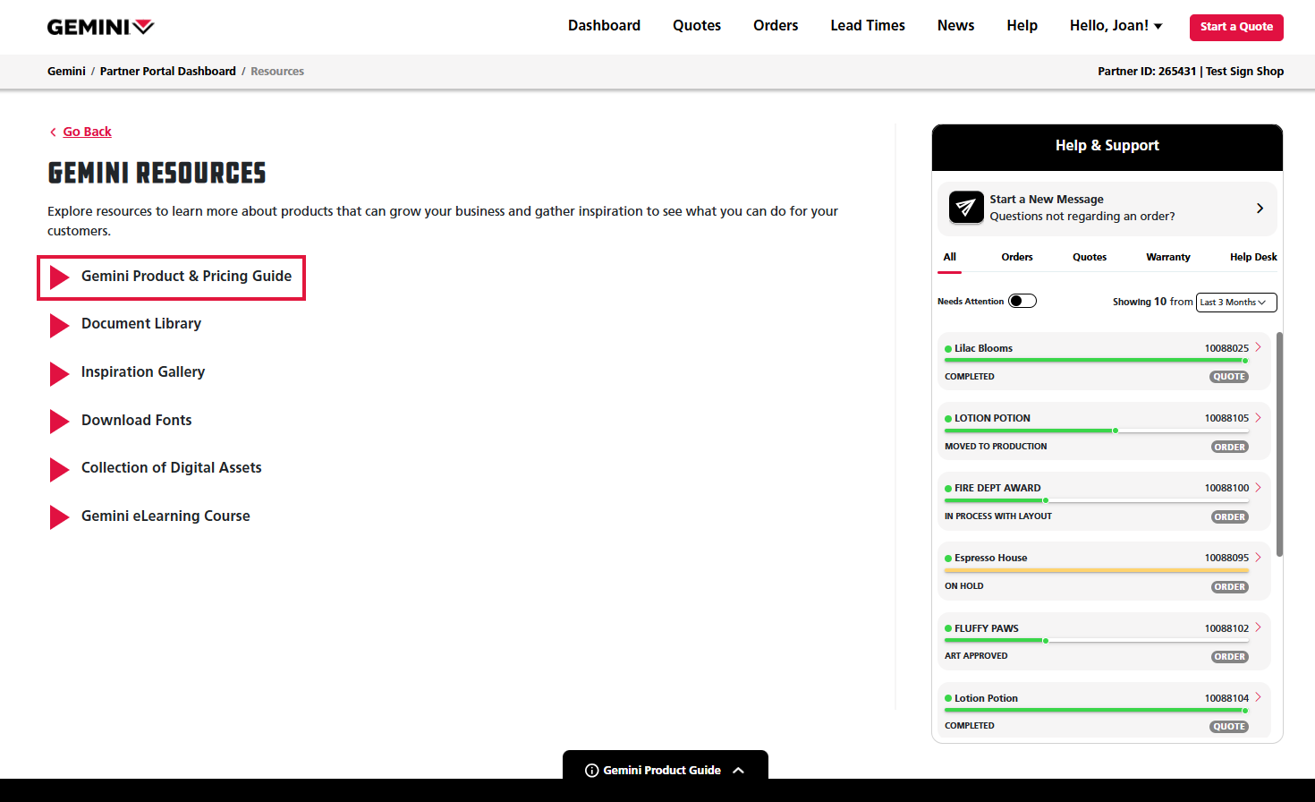 If you have any questions while trying to access a Gemini catalog, click the Start a New Message button with the black paper airplane icon on the Help & Support panel at the right of the screen to contact your customer experience team.